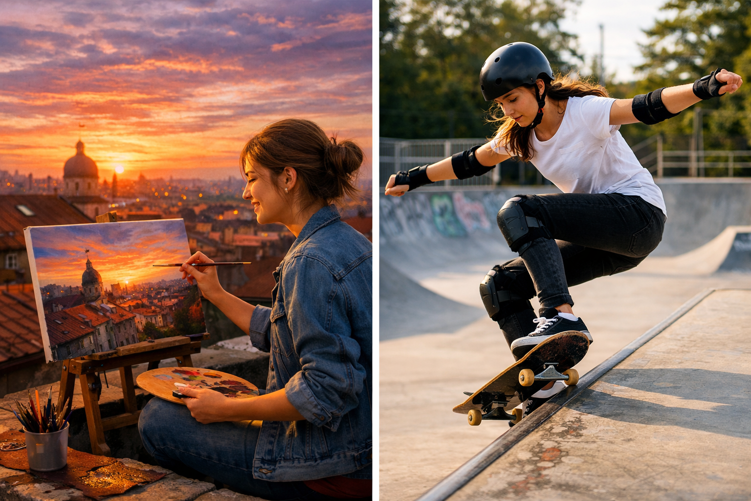 ❌ “The girl is painting. The boy is skateboarding.”