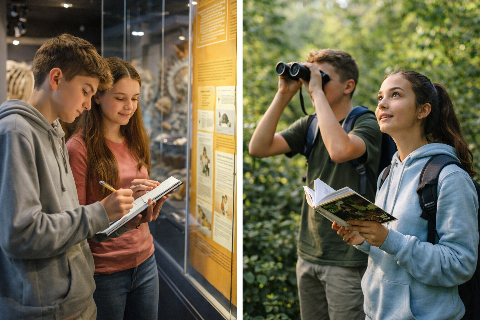 In the first photo, they seem to be in a museum. It looks as though they are taking notes for a school assignment. They might be enjoying discovering information that could add an interesting element to their project.