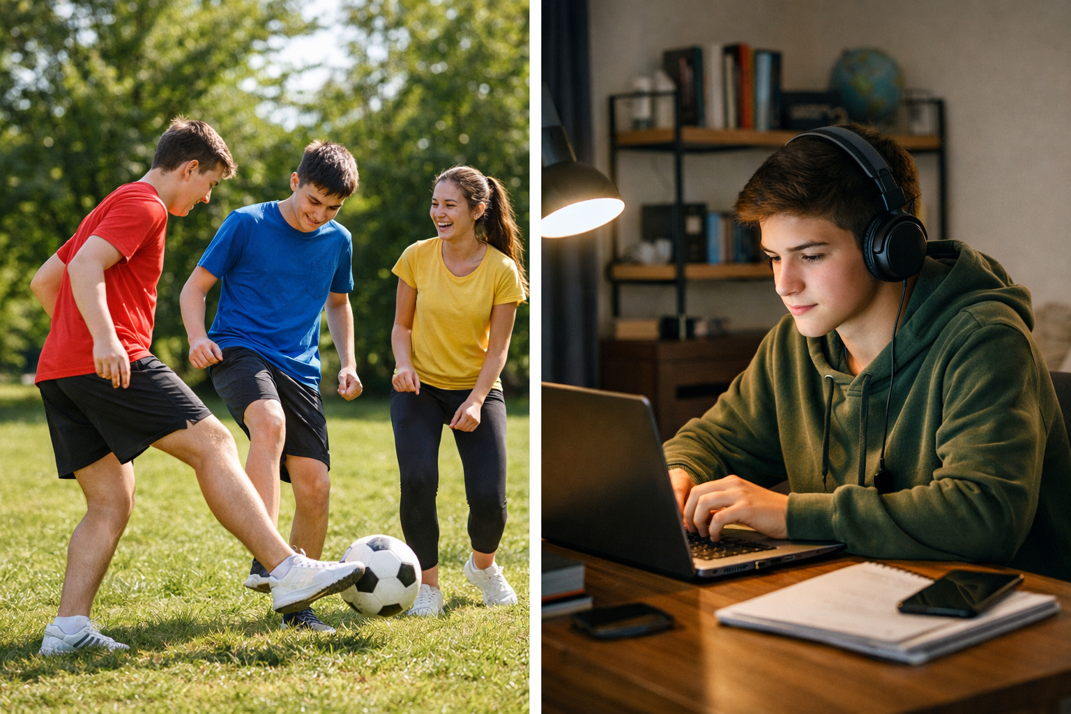 While the first activity seems more social and physically exciting, the second one appears calm and mentally stimulating. Overall, both photos show teenagers making the most of their time, but in completely different ways.